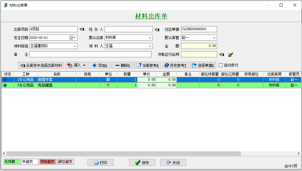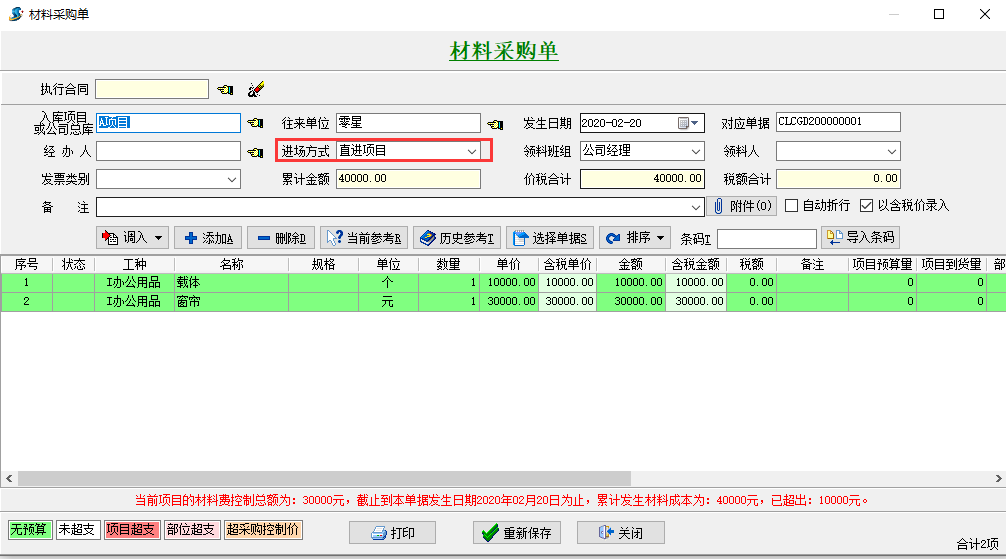 【材料訂貨單】也稱之為:材料驗收報告單、材料出入庫單,是材料購置時,材料抵達當場后要填寫的單據(jù)。在單據(jù)填寫時入場方法分成:采購入庫和直進項目。與別的出入庫單同樣,入場方法挑選直進項目時,清單中的材料額度會直接進入單據(jù)選定的項目成本中。
