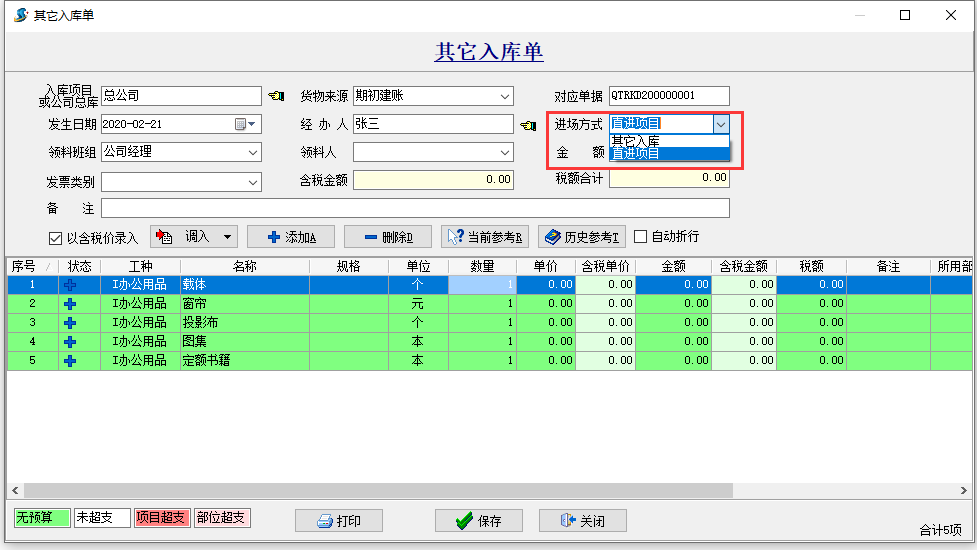 【別的出入庫單】一般用在初期庫存量鍵入或材料來源于不牽涉應(yīng)付款的狀況。在填寫別的出入庫單時入場方法挑選:直進項目,那麼單據(jù)清單中材料的額度會直接進入單據(jù)所挑選的項目成本中。假如選取了別的進庫,那麼這批材料的數(shù)額不容易立即反應(yīng)到項目成本中,這批材料務(wù)必出入庫后才會進到項目成本(這批材料的成本以出入庫時需填寫單據(jù)中的數(shù)額為標準)。