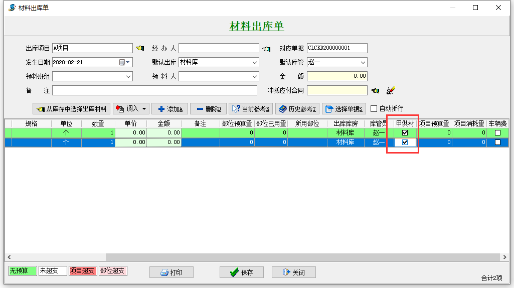 【材料出入庫單】在材料庫存量單填寫的情況下,在清單中挑選甲供,則該材料會進到項目甲供成本。