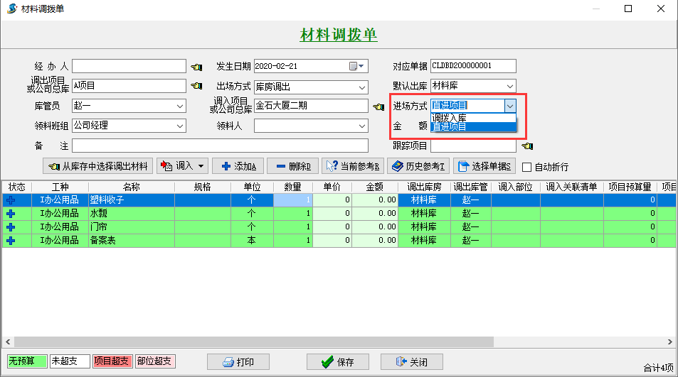 【材料調(diào)撥單】適用于:項目與項目中間的材料調(diào)拔,或企業(yè)總庫與項目中間的材料調(diào)拔。在填寫時要挑選好調(diào)成項目和加入項目。調(diào)成項目有二種登場方法:倉庫調(diào)成和隊組繳料,加入項目有二種入場方法:調(diào)拔進庫和直進項目。入場方法挑選直進項目時,清單中的材料額度會進到加入項目的成本中。假如調(diào)成項目,登場方法挑選的是隊組繳料,也就是以項目當場立即調(diào)成的,這時調(diào)出項目的成本中會減掉清單中材料的額度。