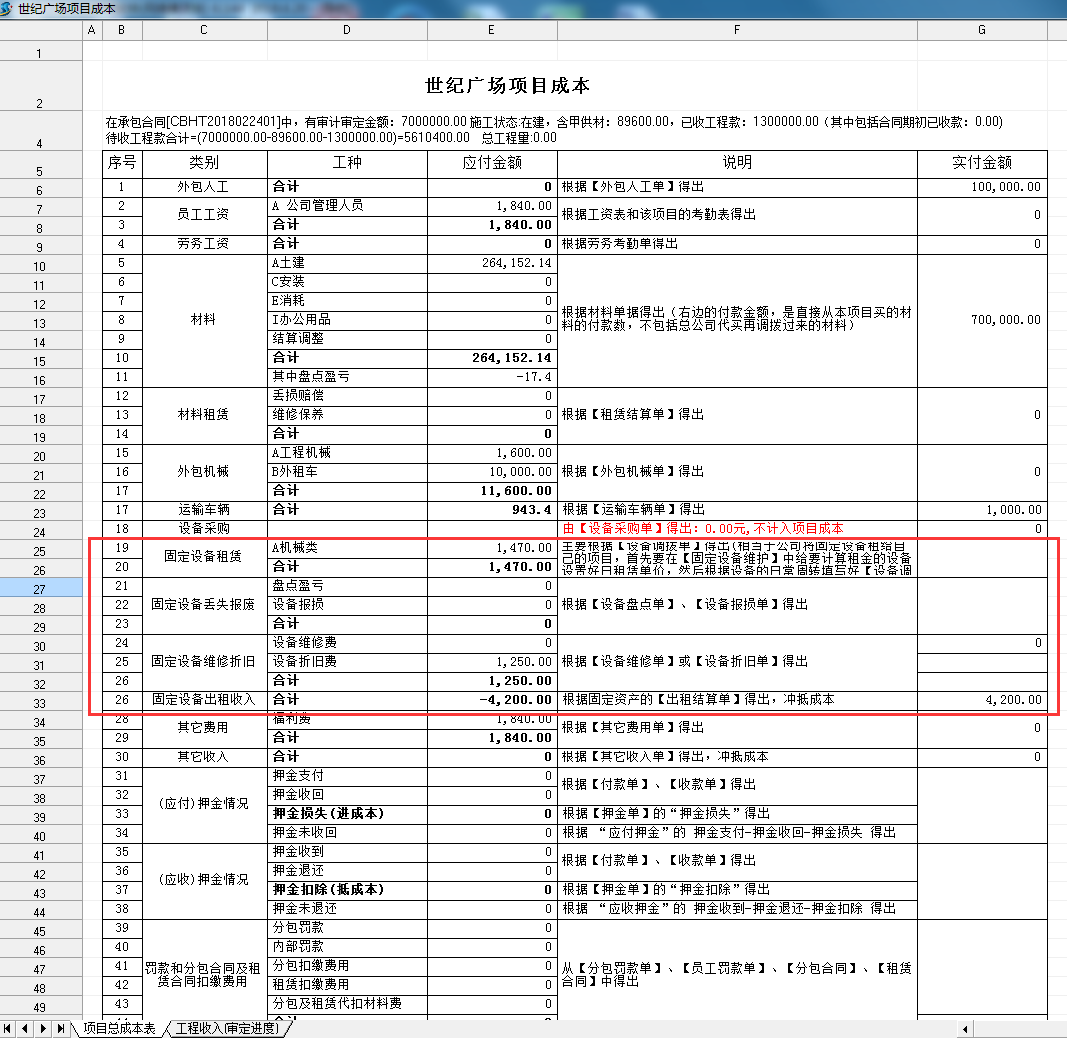 在工程項目項目管理軟件【服務器維護】-【系統軟件全局性設置】-【價錢總數設置中】有設備計算成本方法的自動開關,如下圖:默認設置電源開關不開啟時,以【內部租賃設備折舊費設備報損設備匯總】來計算成本。以內部租賃測算設備成本費時,先在設備維護保養中設置好租賃單價(租賃單價以日為企業,單價設置為70,便是70元一天),如下圖:...