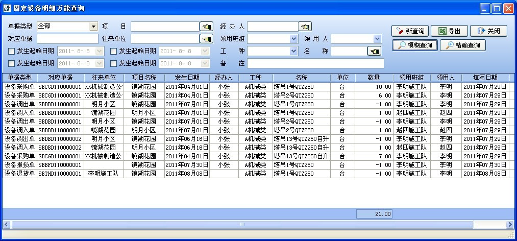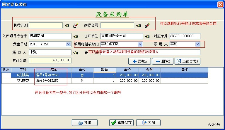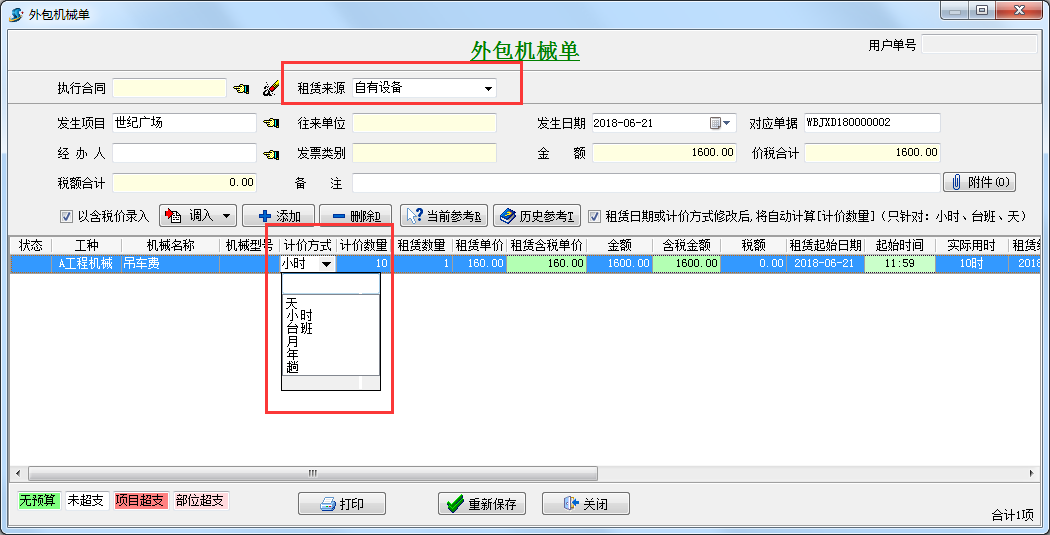 存儲后返回到【設備訂購單文件目錄】中,如下圖:如果我們運用設備租用(自動式計算租賃費)來測算設備折舊,這時我們可以查詢該設備導致的租賃費,點一下主菜單【固定設備】->【設備數據分析(某一新新項目總產量、租用、折舊、維修數據分析)】,結果如下圖:...