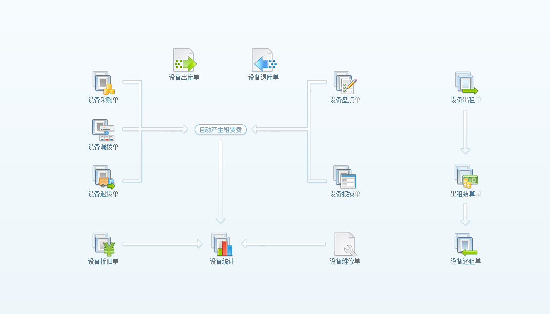 點擊主菜單中的【設備】->【設備出庫單】打開設備出庫單列表點【新建】按鈕,輸入如下:。點擊主菜單中的【設備】->【設備退庫單】打開設備退庫單列表點【新建】按鈕,輸入如下:。保存后返回設備出庫單列表,如下圖所示:。...