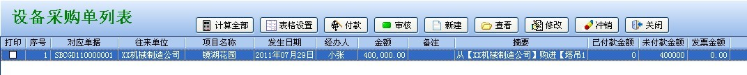 點(diǎn)一下主菜單中的【設(shè)備】->【設(shè)備訂購(gòu)單】打開(kāi)設(shè)備訂購(gòu)單文件目錄點(diǎn)【創(chuàng)好】功能鍵,錄入如下所示所顯示: