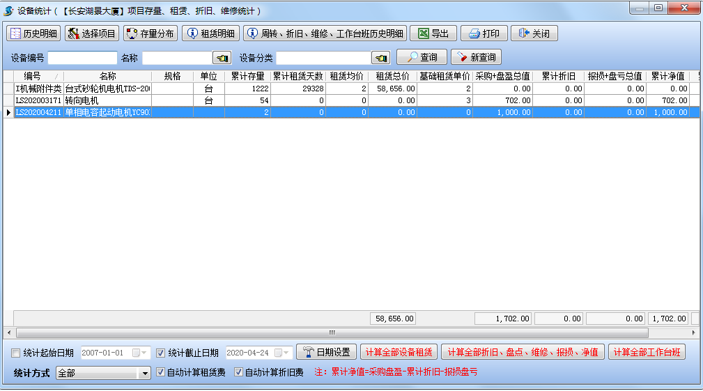 如果我們運(yùn)用設(shè)備租用(自動(dòng)式計(jì)算租賃費(fèi))來(lái)測(cè)算設(shè)備折舊,這時(shí)我們可以查詢?cè)撛O(shè)備導(dǎo)致的租賃費(fèi),點(diǎn)一下主菜單【固定設(shè)備】->【設(shè)備數(shù)據(jù)分析(某一新新項(xiàng)目總產(chǎn)量、租用、折舊、維修數(shù)據(jù)分析)】,結(jié)果如下圖: