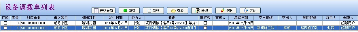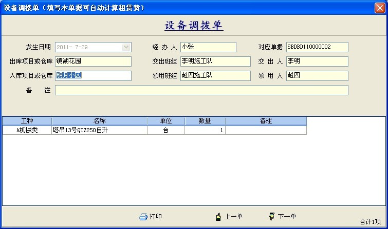 (2)【設(shè)備調(diào)撥單】是用以報(bào)備最新項(xiàng)目中間造成設(shè)備周轉(zhuǎn)資金工作流程的單據(jù)。入錄本票據(jù)前,先要錄入要選用的基礎(chǔ)信息中的【設(shè)備維護(hù)】、【最新項(xiàng)目維修保養(yǎng)】。