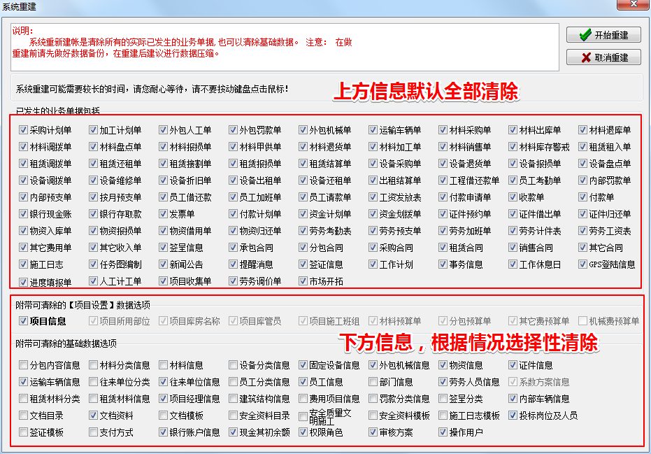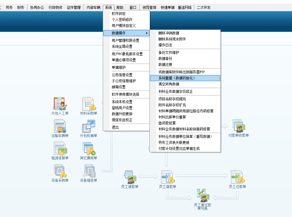點擊菜單欄系統下的數據操作系統重建(數據初始化),清除系統原始示例數據,清除不必要的基礎數據。如:[項目信息]、[單位信息]、[員工信息]、[材料信息]、[固定設備信息]等。如下圖所示。