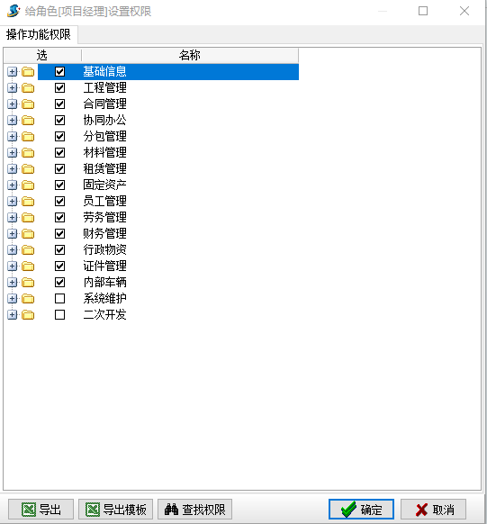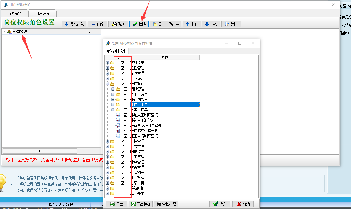 選擇崗位角色名稱,點擊權(quán)限按鈕彈出為崗位角色設(shè)置權(quán)限按鈕,鉤住分配權(quán)限的功能模塊,點擊確定按鈕,如圖所示: