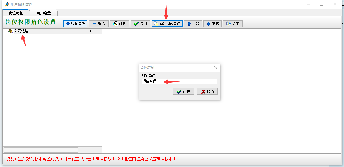 如果新的崗位角色與當(dāng)前系統(tǒng)中現(xiàn)有的崗位角色具有相同的系統(tǒng)操作權(quán)限,則可以選擇當(dāng)前的崗位角色,點擊復(fù)制崗位角色按鈕。復(fù)制后,新的崗位角色具有與當(dāng)前崗位角色相同的系統(tǒng)操作權(quán)限,如圖所示: