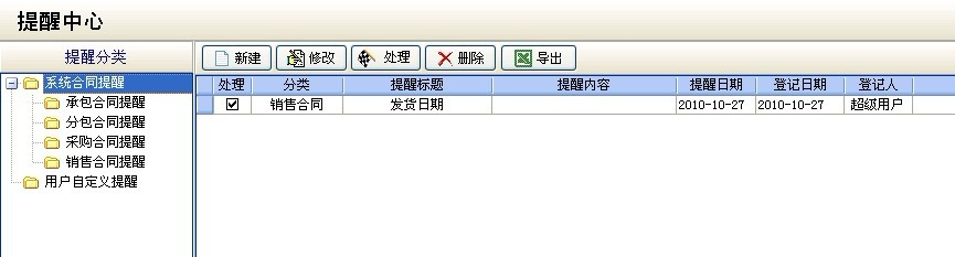 提醒中心分【系統(tǒng)軟件合同書提醒】和【用戶自定義提醒】。在其中【系統(tǒng)軟件合同書提醒】要在合同控制模塊中的【合同書提醒】中添加、改動、刪掉操作,提醒中心只有查詢。【用戶自定義提醒】在【提醒中心】中開展加上、改動、刪掉操作。...