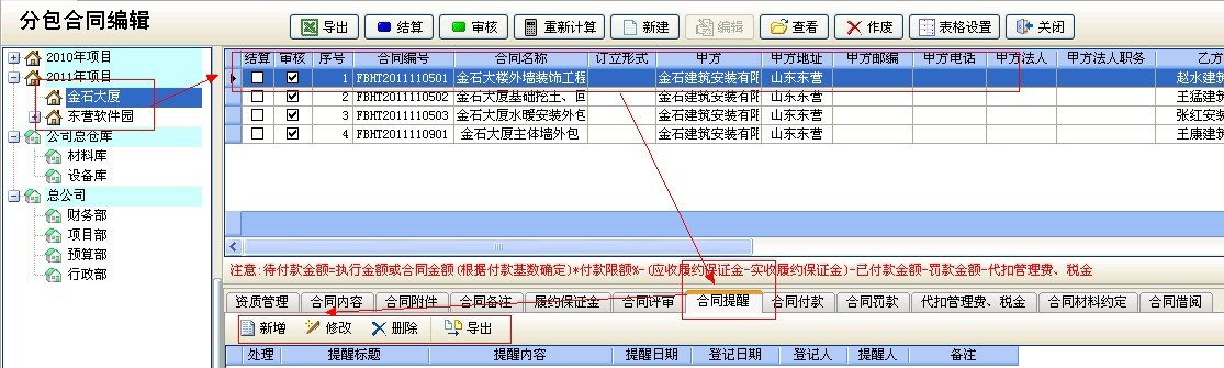 在其中【系統軟件合同書提醒】要在合同控制模塊中的【合同書提醒】中添加、改動、刪掉操作,提醒中心只有查詢。如下圖: