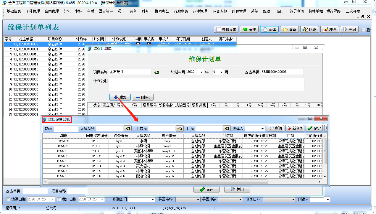 點擊【維保管理方法】-【維保計劃單】填好‘維保計劃單’,挑選項目規劃,點擊添加按鍵,添加該新項目下密切相關的‘維保設備臺賬’。如下圖: