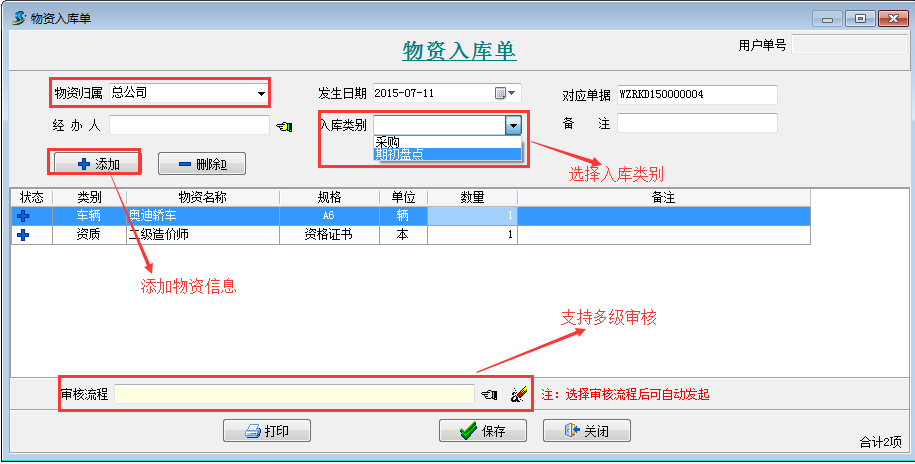 【物資入庫單】是用于備案產(chǎn)生的物資進庫的單據(jù)。