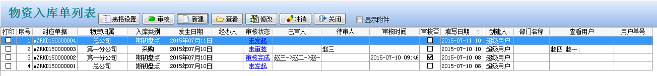 點一下主菜單中的【行政部門物資】->【物資入庫單】開啟物資入庫單列表點【新創(chuàng)建】按鍵,入錄如下所示: