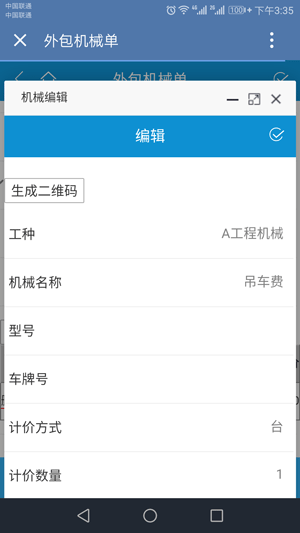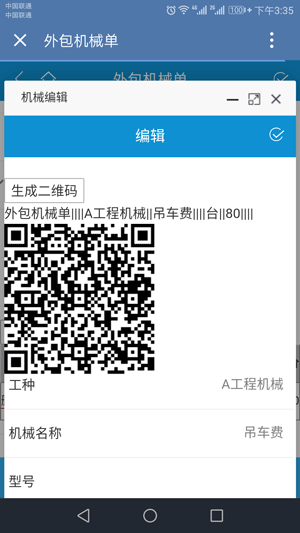 2、金石工程管理軟件移動端還可以生成二維碼,在配備好微信企業版的條件下,進到手機上端單據填好并開啟業務外包機械單,如下圖所示