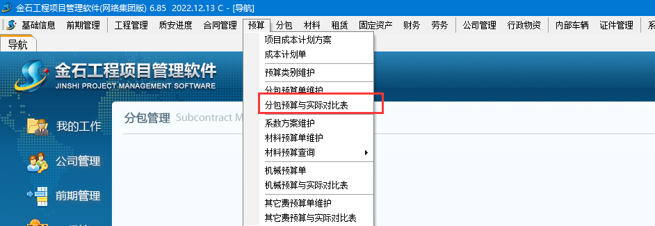 | 專業(yè)分包預(yù)算 | 專業(yè)分包合同 | 分包進(jìn)度驗(yàn)收 | 分包結(jié)算驗(yàn)收 | 分包扣款 | 分包統(tǒng)計(jì) |
