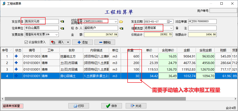 新建【工程結算單】,注意選擇結算類型,選擇從工程量清單分解中調入,手動輸入本次申報的工程量數值并保存。如下圖所示,