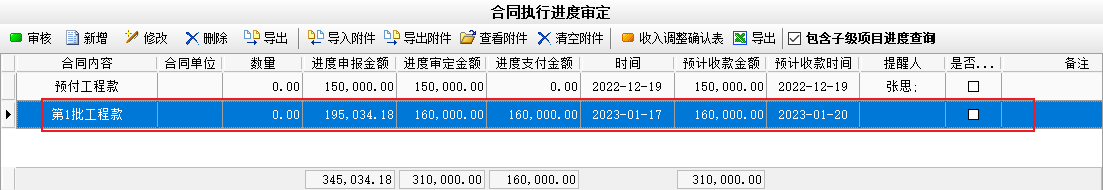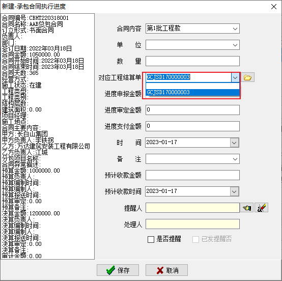 在“合同執行進度”界面點擊[新增],在彈窗中,選擇對應的【工程結算單】,如下圖所示,