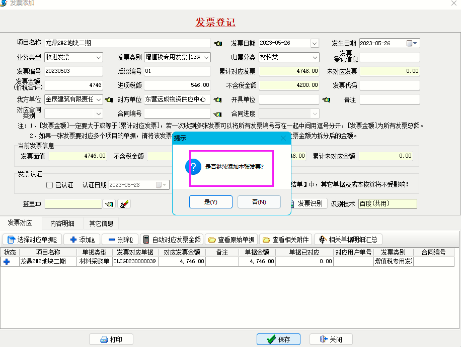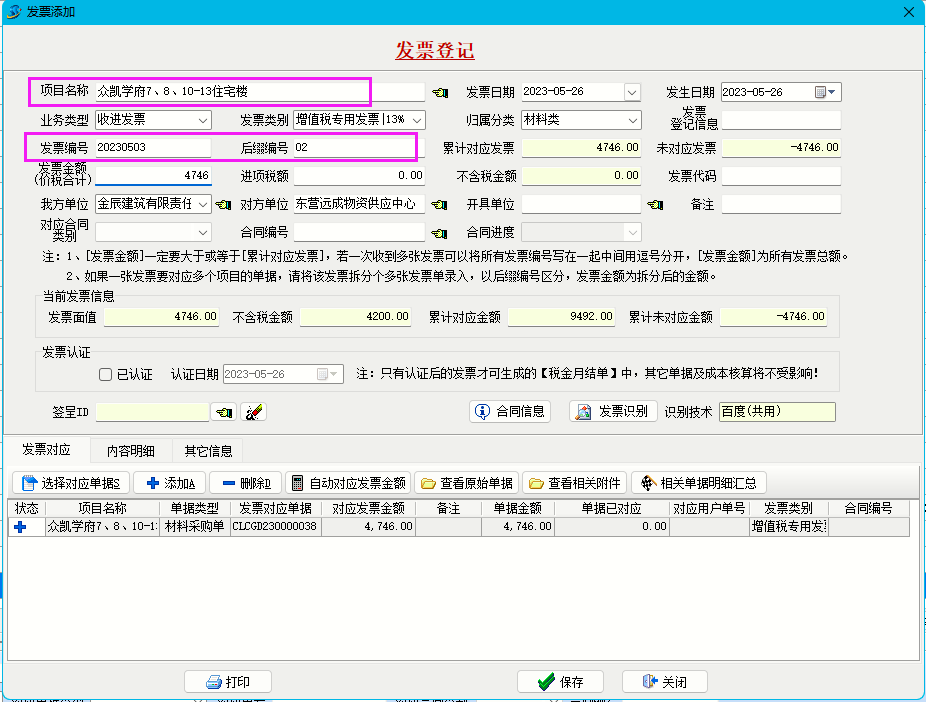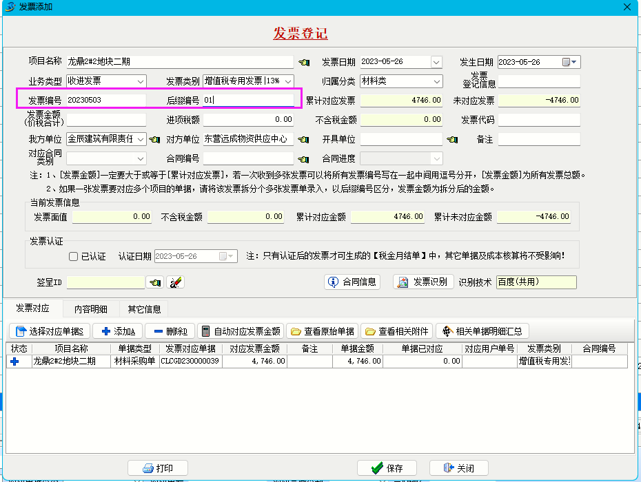 在使用項目管理過程中多個項目可能會找一個供應商供貨,多次供貨,供應商開出一張發票。金石系統支持按照項目對發票進行分攤。要對應多個項目的單據,需要將發票拆分個多張發票單錄入,以后綴編號區分,發票金額為拆分后的金額。