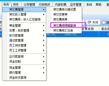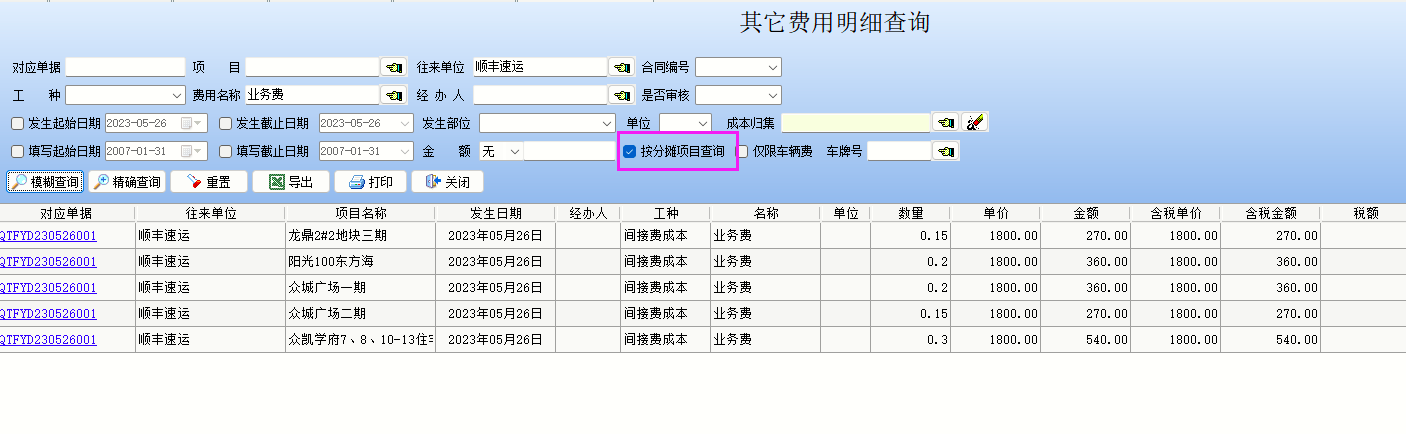 3、工程項目管理軟件還提供分攤費用的查詢,在菜單財務里點擊其他費用明細查詢,出現其他費明細查詢界面