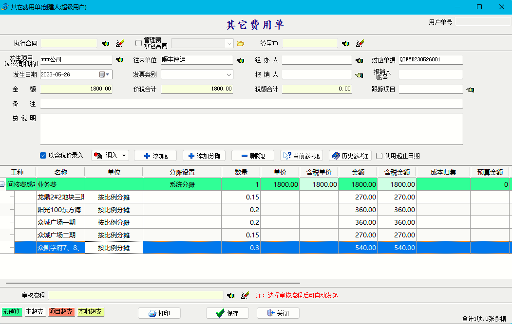 分攤設置中分攤比例之和必須等于1。填寫其它費用單時選擇系統分攤會自動生成分攤項目。