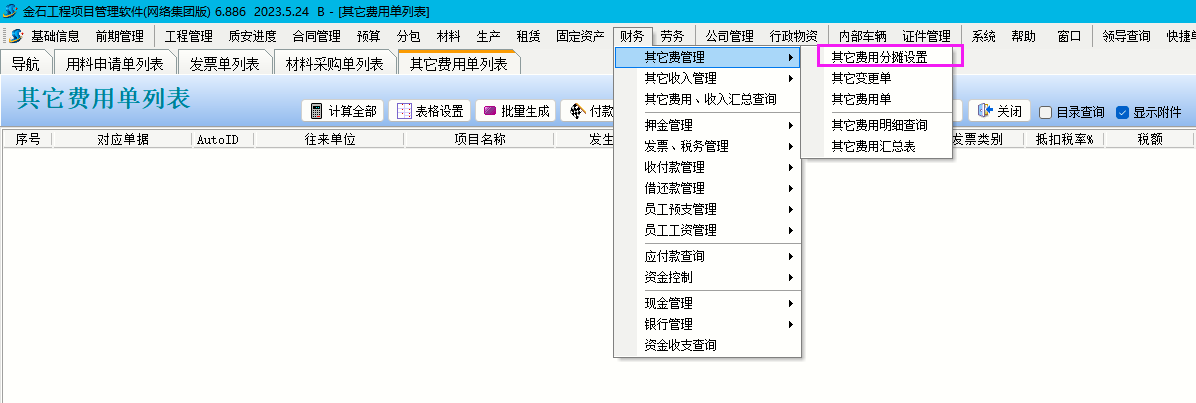 1、打開工程項目管理軟件,在財務管理模塊中新建其它費用單,這里我們以快遞費分攤到部門為例,如下圖