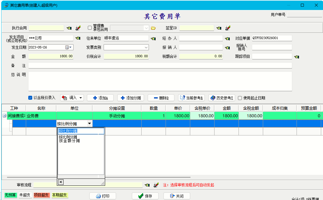 選擇手動分攤可以自行添加分攤項目,并可以設置是按照比例分攤還是按照金額分攤。