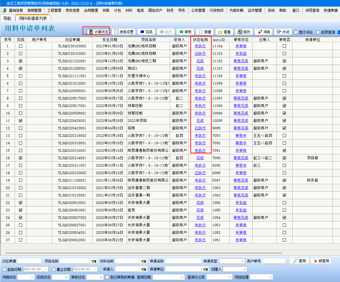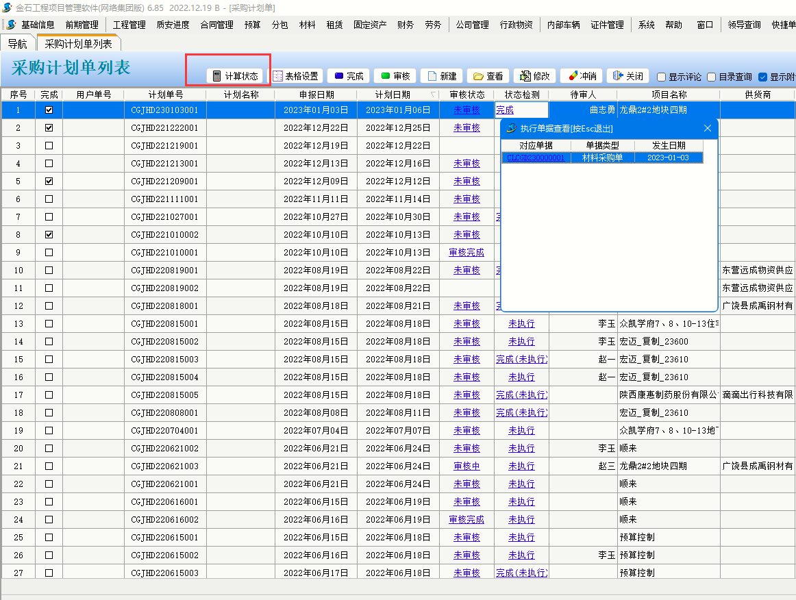 2、采購計劃單列表可以查看執行狀態,點擊計算狀態系統會自動顯示狀態信息。