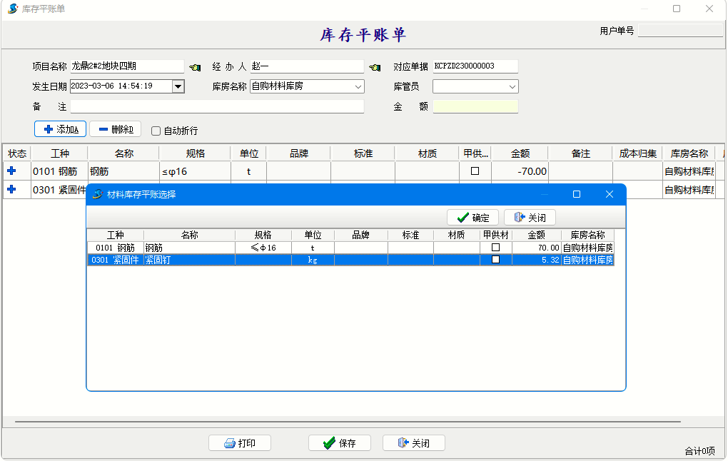 點擊新建可以創建庫存平賬單。點擊添加可以選擇庫存是0,庫值不是0的材料。