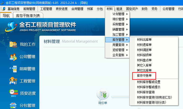 點擊菜單欄【材料】-【庫存查詢】-【庫存平賬單】