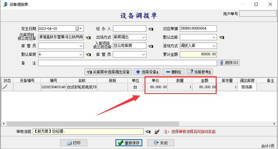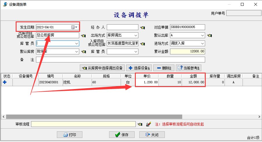 【設備調撥單】自[公司庫房]調出設備到[長深高速]項目,[發生日期]為2023-4-1