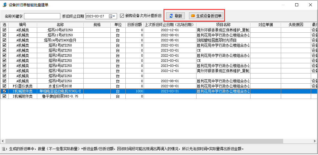 注:生成的折舊單中,數里(不-定是實際數里) =折舊金額/日折舊額,因該時間段可能出現調出再調入的情況,所以無法按時間*實際量得出折舊金額。