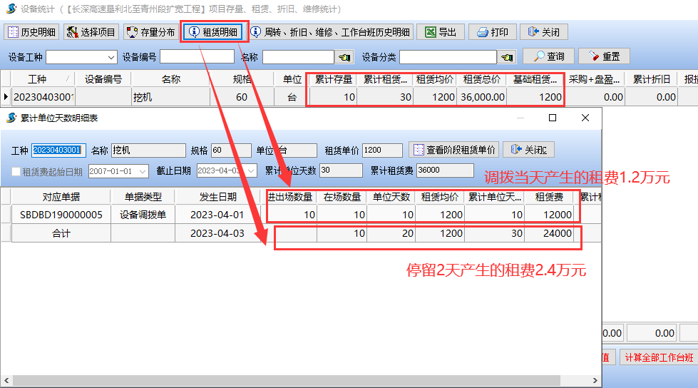 例如:4月1日開始使用設備,日租金1200元,4.3日我們查詢下設備統計和項目成本