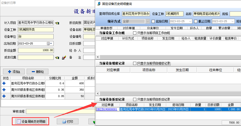 ②[設備周轉歷史明細]可查看該設備的歷史[維修記錄、工作臺班、折舊記錄]