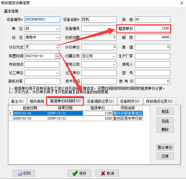 注:①使用本功能需在(下圖)【設備維護】內維護好租賃費、若不同項目租費不同也可為每個項目單獨設置[租賃單價時間段]