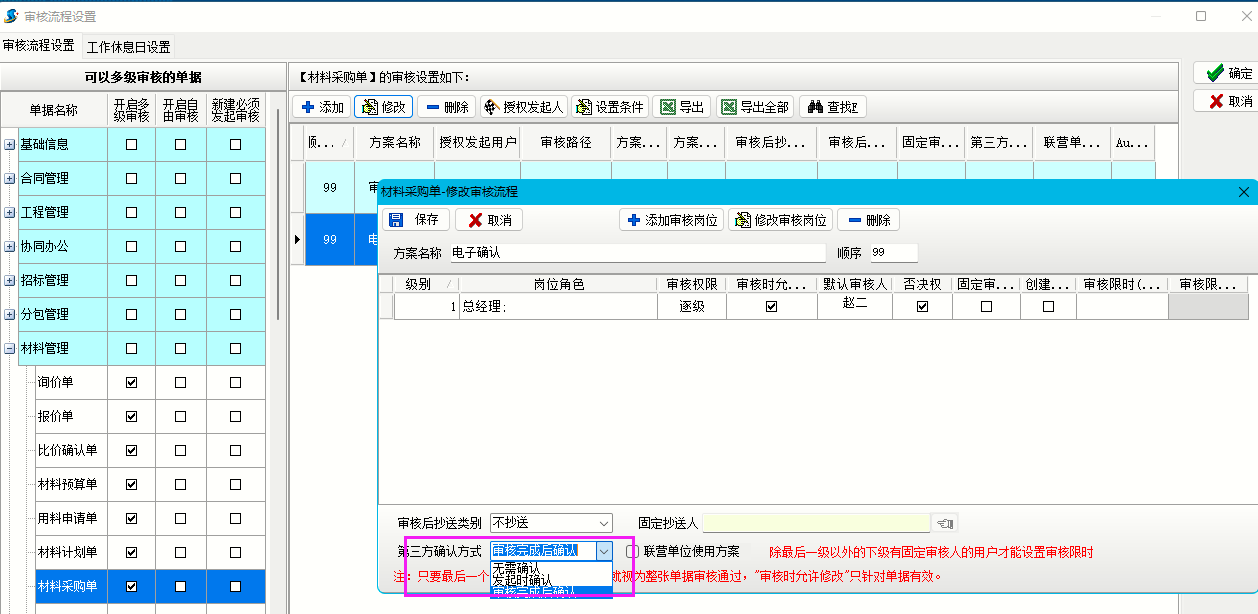 在【系統維護】-【審核流程設置】中設置確認方式。