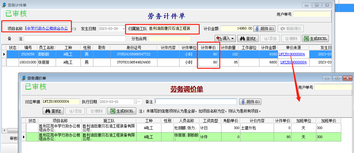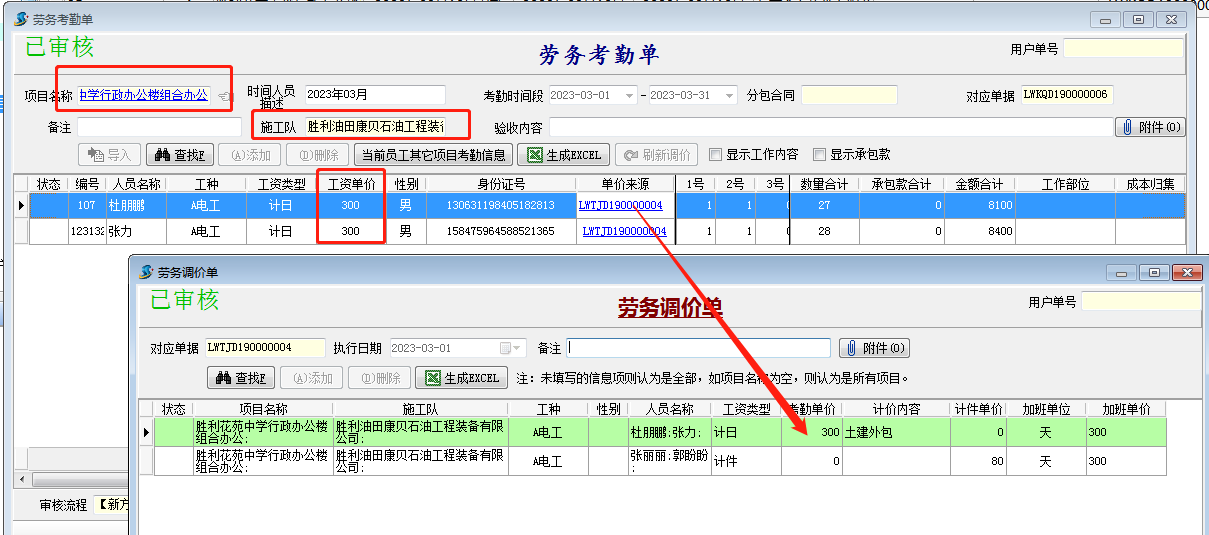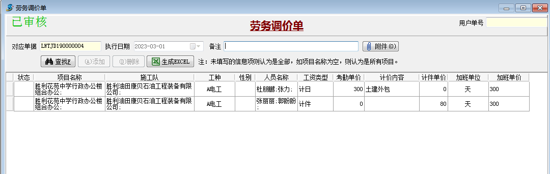 1)在考勤單、加班單、計(jì)件單等業(yè)務(wù)單據(jù)[中項(xiàng)目名稱]、[施工隊(duì)]及[工資類(lèi)型]需完全一致,才能實(shí)現(xiàn)調(diào)價(jià)。