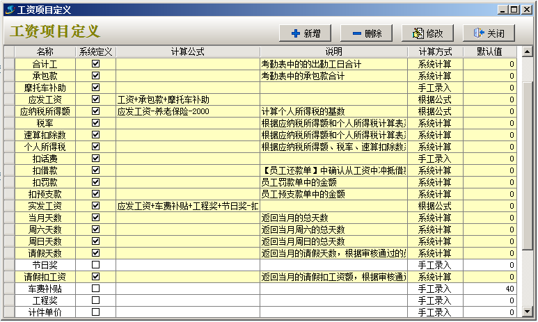 注:黃色區(qū)域的項目是系統(tǒng)定義的,不能進(jìn)行“刪除”和“更改”的操作。“計算方式”是“根據(jù)公式”的可進(jìn)行公式的修改。白色區(qū)域的項目可自己進(jìn)行補充或進(jìn)行增刪的操作。可以作為實發(fā)工資中的變量使用。