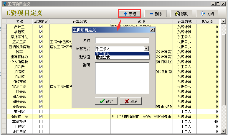 點擊“新增”按鈕,彈出“工資項目定義”對話框: