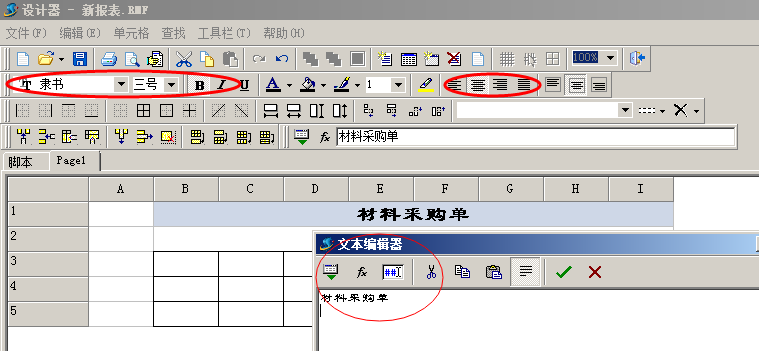 雙擊第一行輸入,在彈出的文本框中,輸入打印標題的名稱例如材料采購單。然后選擇字體及大小。