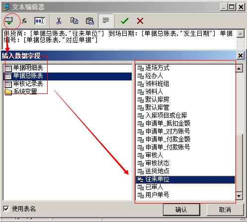 我們在第二行中,再輸入單據中需要打印的相關內容,例如:供貨商、到場日期、單據編號等。其中,供貨商、到場日期、單據編號等文本直接輸入就可以,后面的數值要從單據字段中調用,操作方法如下圖,選擇對應的字段就可以。