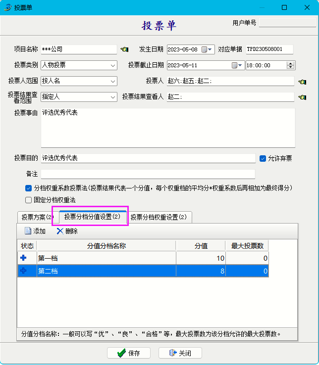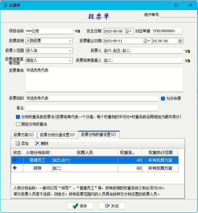 新建投票單,設置投票類別、投票截止日期、投票人、投票方案和投票分值計算方法。