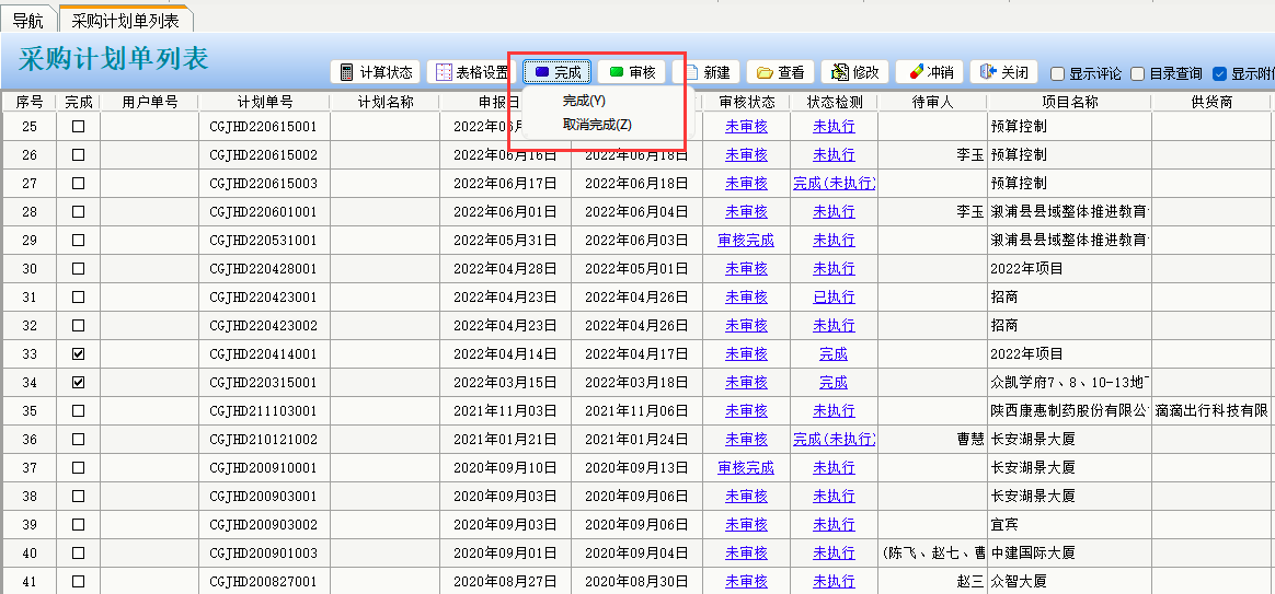 狀態顯示‘完成’代表全部采購完成;‘未執行’代表沒有采購;‘已執行’代表采購了一部分,未采購完。;‘完成(未執行)’代表手動點擊了完成。系統中手動點擊完成表示不再采購,后續單據也不能調取。如采購完成,系統會自動顯示完成。