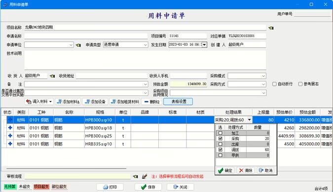 工程部根據預算對項目部上報的【用料申請單】進行審核處理,如下圖所示,