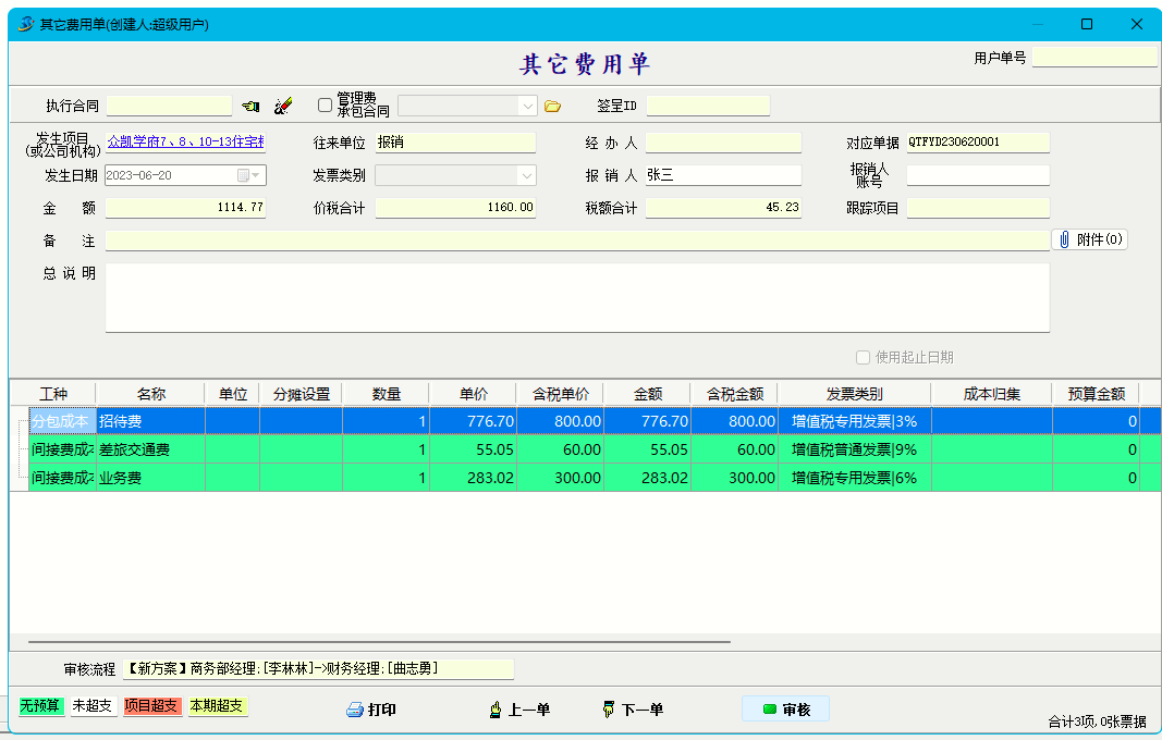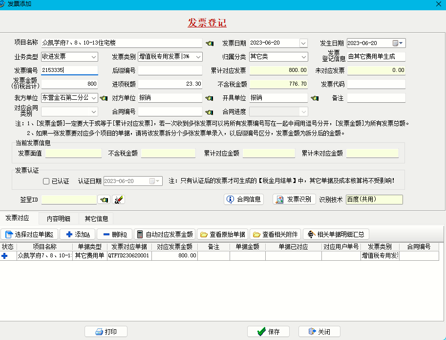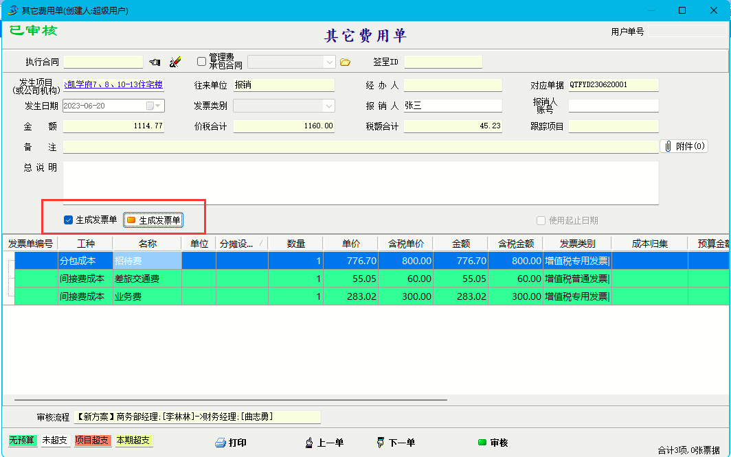 在我們實際報銷過程中一般會有多張發票,如果一張張填寫發票單效率很低,金石軟件支持在填寫報銷單時同時自動生成發票單。
