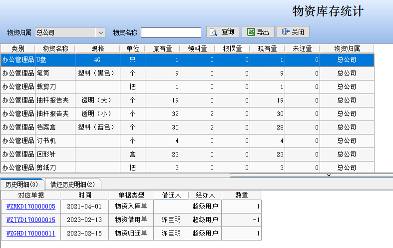 對歸屬單位的所有物資統計,體現原有量、領料量、報損量、現有量和未還量等。