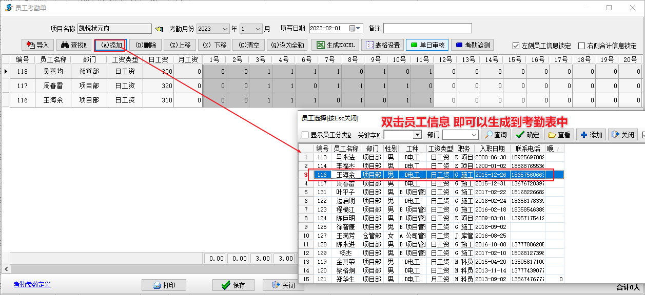 (1)手工錄入員工考勤,點擊添加按鈕,選擇員工到考勤單據中,如下圖所示: