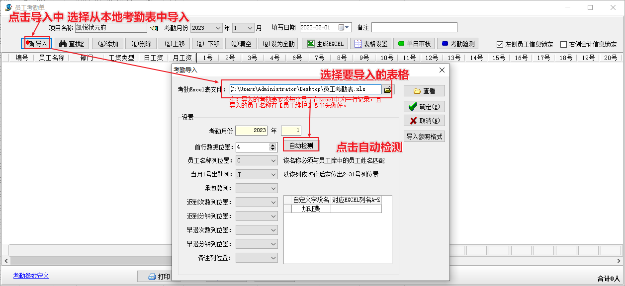點擊導入的按鈕,選擇考勤Excel表格,填寫首行數據的行數,對應員工名稱的列位置,當月1號出勤列位置,如下圖所示: