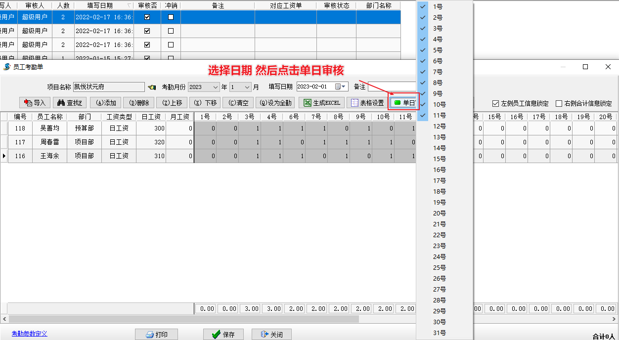 添加員工到考勤表之后手動輸入員工考勤信息到考勤表中,輸入完成當日考勤信息之后選中當日考勤信息,點擊“單日審核”審核當日考勤信息(單日審核后,考勤信息無法再次修改),如下圖所示: