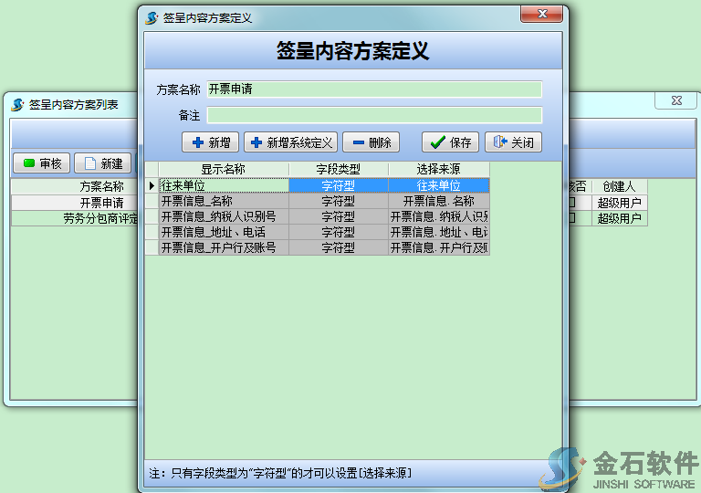 再以開(kāi)票申請(qǐng)為例,介紹下簽呈內(nèi)容方案定義的用法,同樣的打開(kāi)【簽呈內(nèi)容方案定義】。